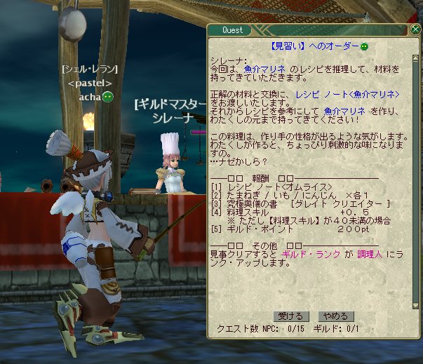 酩酊持ちゆえにいつも料理ギルド=シェル・レランにお世話になっていたことから、いつしか隠れレラン信徒、シレーナ様の信者となる。その正体はシレーナ様のために謎肉謎水監視に目を光らすレランの刺客。料理スキル0でもレランの料理長(4つ星)。